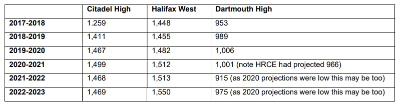While there are always year to year adjustments, based on enrollment, the number of teacher cuts do not match enrollment changes. Three examples of high school enrollment numbers are below. 2021 and 2022 are based on HRCE’s own projections as calculated in 2018.1,2