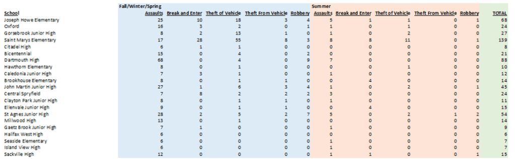 Summarized statistics of that FOIPOP release are as follows. The Department of Education and Early Childhood Development does not publish lower numbers than 11 due to privacy reasons. Why? Evidently, it’s easier to determine someone’s identity if the number is low. Any number between 1 and 10 will be signified by blanks. Any number omitted by the FOIPOP response is assumed to be zero. This does not affect the sexual harassment and sexual misconduct summaries much, however insight into sexual assault totals is very much blurred. Please note, this is not what was asked for. The Department of Education and Early Childhood Development provided an additional breakdown by grade which unfortunately makes finding the actual totals impossible.