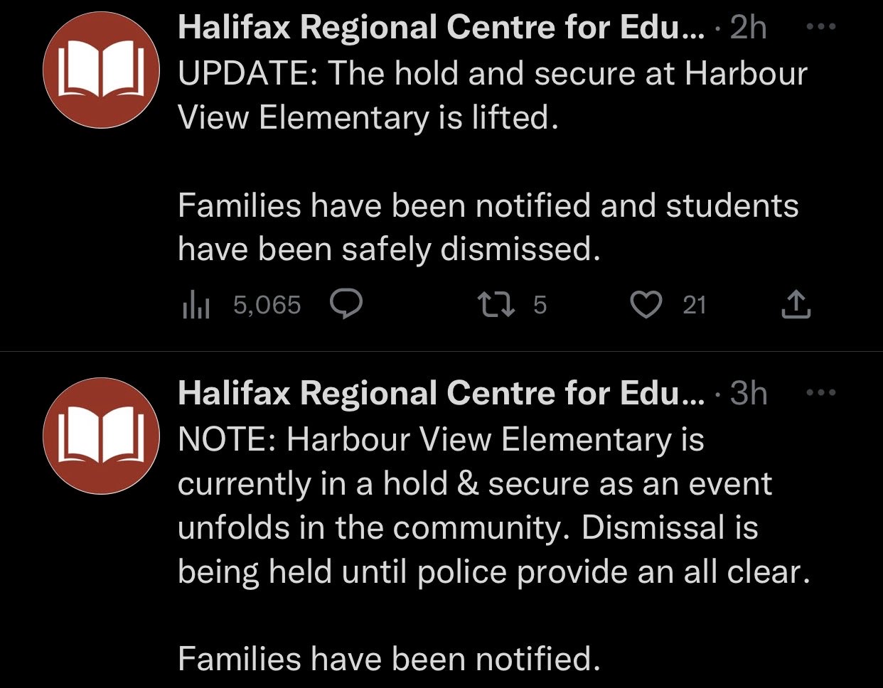 During that time, Halifax Regional Centre for Education posted updates about a Hold and Secure at nearby Harbour View Elementary. The difference? Halifax Regional Police actually provided details.