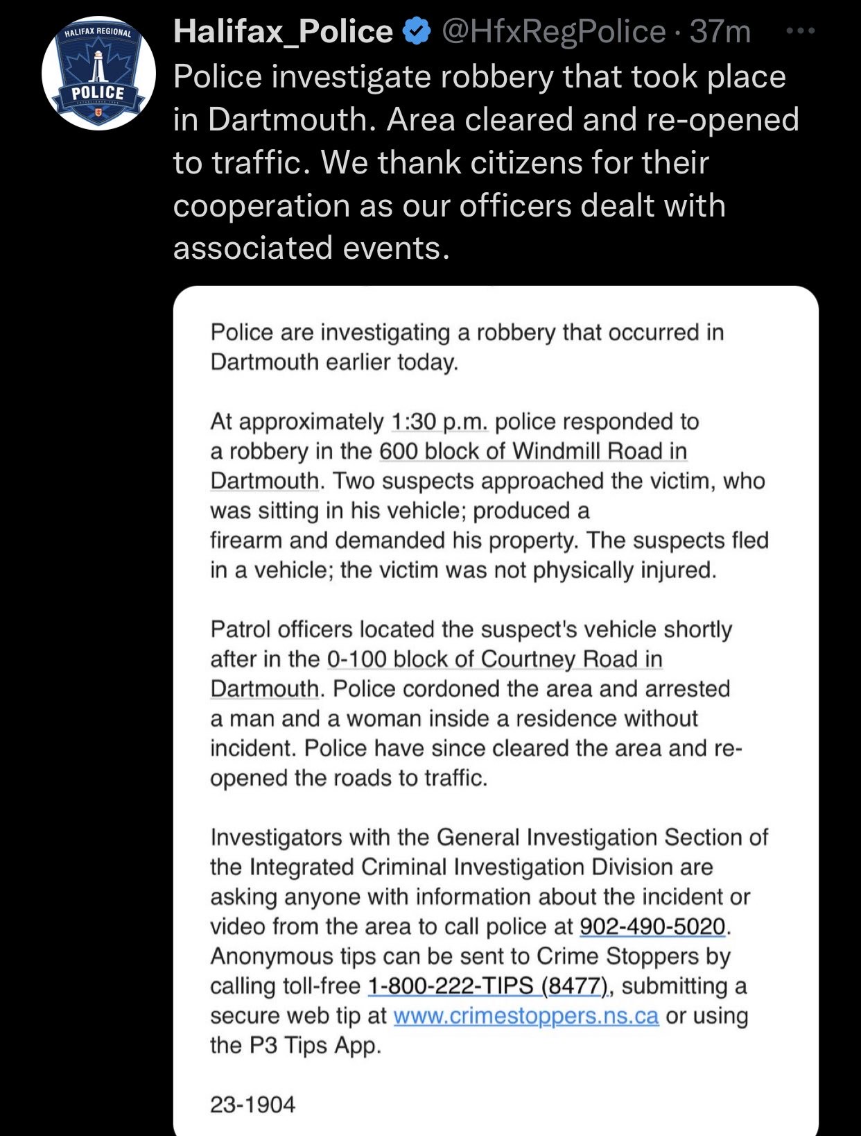 When a Hold and Secure is initiated by a school, there’s often a public announcement by the Regional Centre for Education and/or the school itself. This did not occur. For instance, on January 5th, 2023 Halifax Regional Police posted an update via X (formerly Twitter) regarding a robbery involving a suspect with a firearm in Dartmouth.