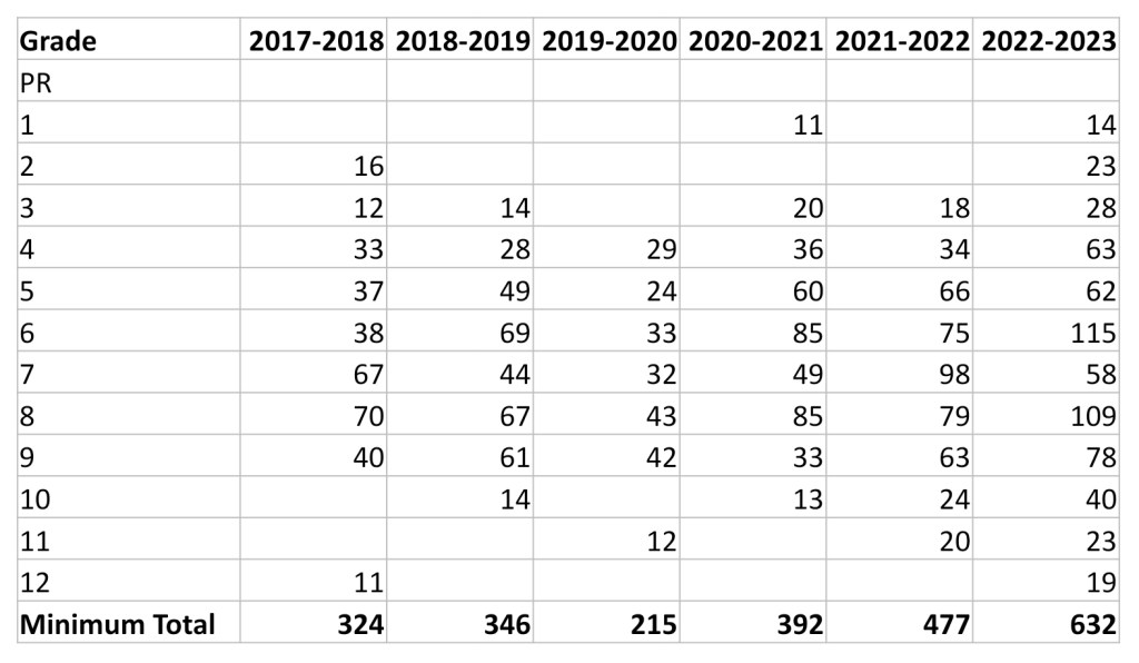 For example, in this data set you have students starting in grade three back in 2017-2018. The amount of sexual harassment incidents exploded to 109 last year when they were in grade 8. That’s an 800% increase for largely the same set of students. This year, as those students are in grade 9, we would expect to see those rates climb even higher. The same goes for grade 8 (a 262% increase between 2017-2018 and 2022-2023). Last year’s grade 7 and grade 6 have a 219% and 210% growth in sexual harassments over 2020-2021. It would be higher if we had the real numbers from back in 2017-2018, but we don’t.