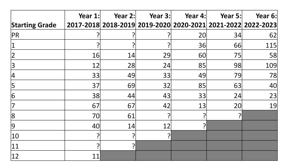 If you look at when a group of students that started a grade then you can see how those people have progressed year over year. You can almost predict the growth rate for future years based on how the data “moves.”